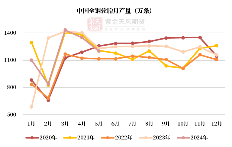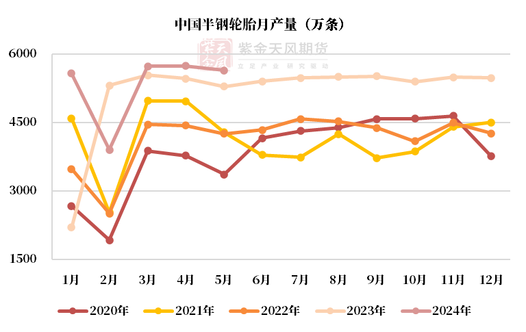 半钢轮胎生产情况:2024年1-5月中国半钢轮胎产量为26603万条,同比大幅增加11.7%,处于历史高位。大致估算可知,2024年1-5月中国半钢轮胎消耗天然橡胶较去年同期多了约7.1万吨。