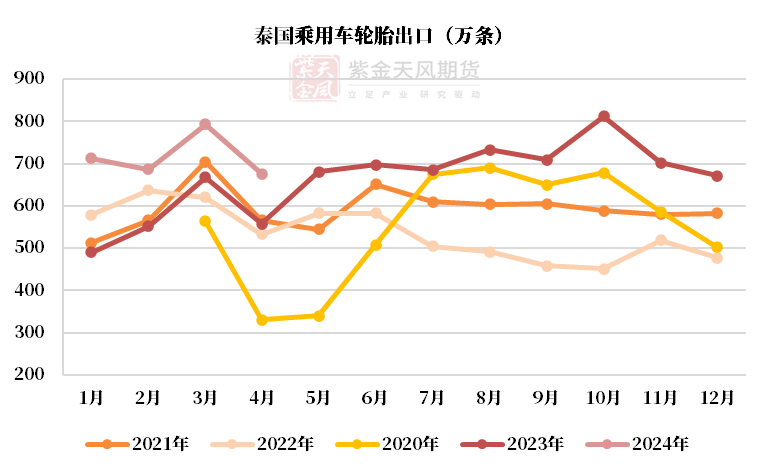 乘用车胎出口情况:2024年1-4月泰国乘用车轮胎出口总量为2869万条,同比大幅增加26.6%,处于历史高位。其中,出口往美国的乘用车轮胎占比52.9%,出口量同比大幅增加50.7%。