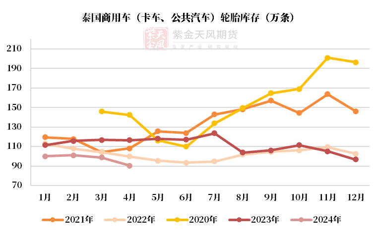 商用车轮胎库存情况:2024年4月泰国商用车轮胎库存同比去年4月下降22.3%(库存相对去年较低),处于历史低位。考虑到今年商用车轮胎出口总量同比增加5.3%,处于历史偏高位置,我们推测今年海外商用车轮胎也存在一定量的需求。