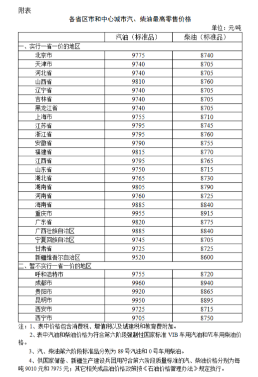 经济观察网讯据国家发改委网站消息,根据近期国际市场油价变化情况,按照现行成品油价格形成机制,自6月13日24时起,国内汽、柴油价格(标准品,下同)每吨分别降低190元、180元。调整后,各省(区、市)和中心城市汽、柴油最高零售价格见附表。