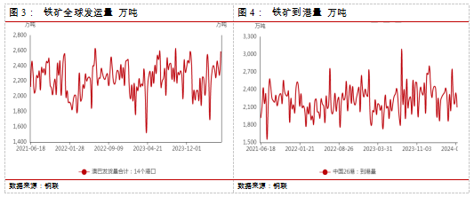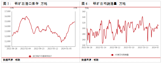 供应端,根据Mysteel全球铁矿石发运量数据显示,本期值为3031.6万吨,周环比减少217.1万吨。从今年累计发运情况看,全球铁矿石发运累计同比增量为2966万吨,其中巴西累计同比增量为1094万吨,非主流累计同比增量为2104万吨,澳洲则表现为累计同比减少232万吨。短期港口检修较少,预计下期全球铁矿石发运量有所攀升。根据Mysteel45港铁矿石到港量数据显示,本期值为2436万吨,周环比增加180万吨。预计下期到港量下降至2200万吨附近。