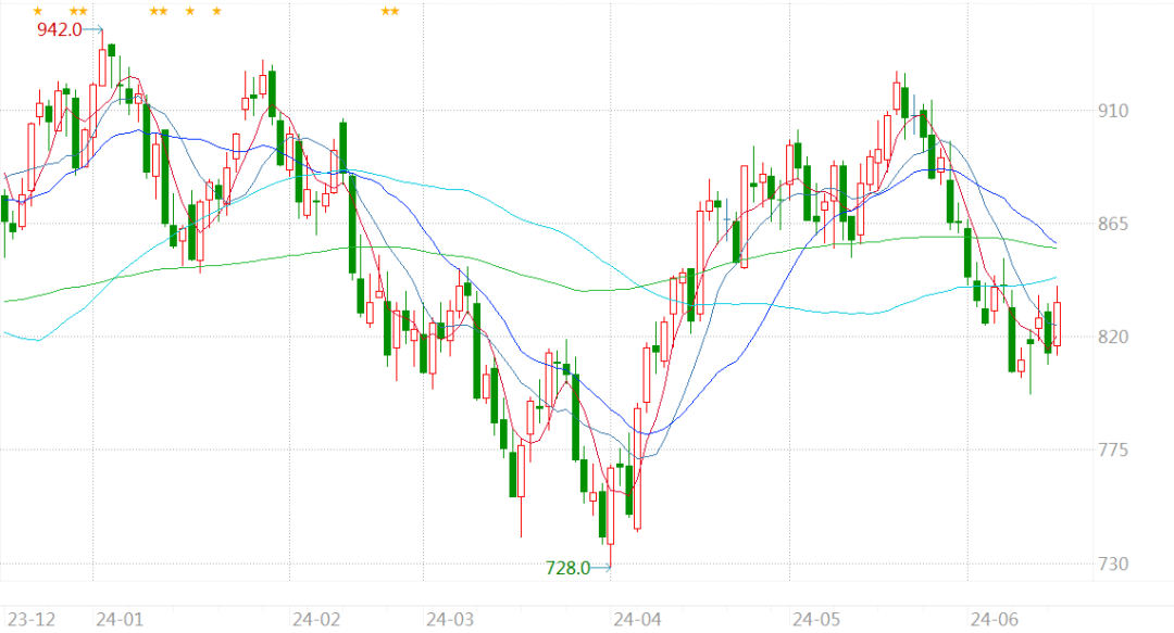 6月11日-6月14日,铁矿2409合约先抑后扬,重心有所下移。开盘831.5元/吨,最高至838.5元/吨,最低797元/吨,收至827.5元/吨,较前一周跌1.4%。