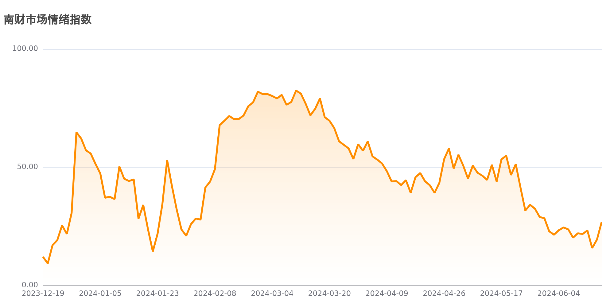 今日南财市场情绪指数为27.0,较前一交易日19.4大幅上涨,市场投资热度明显提升。