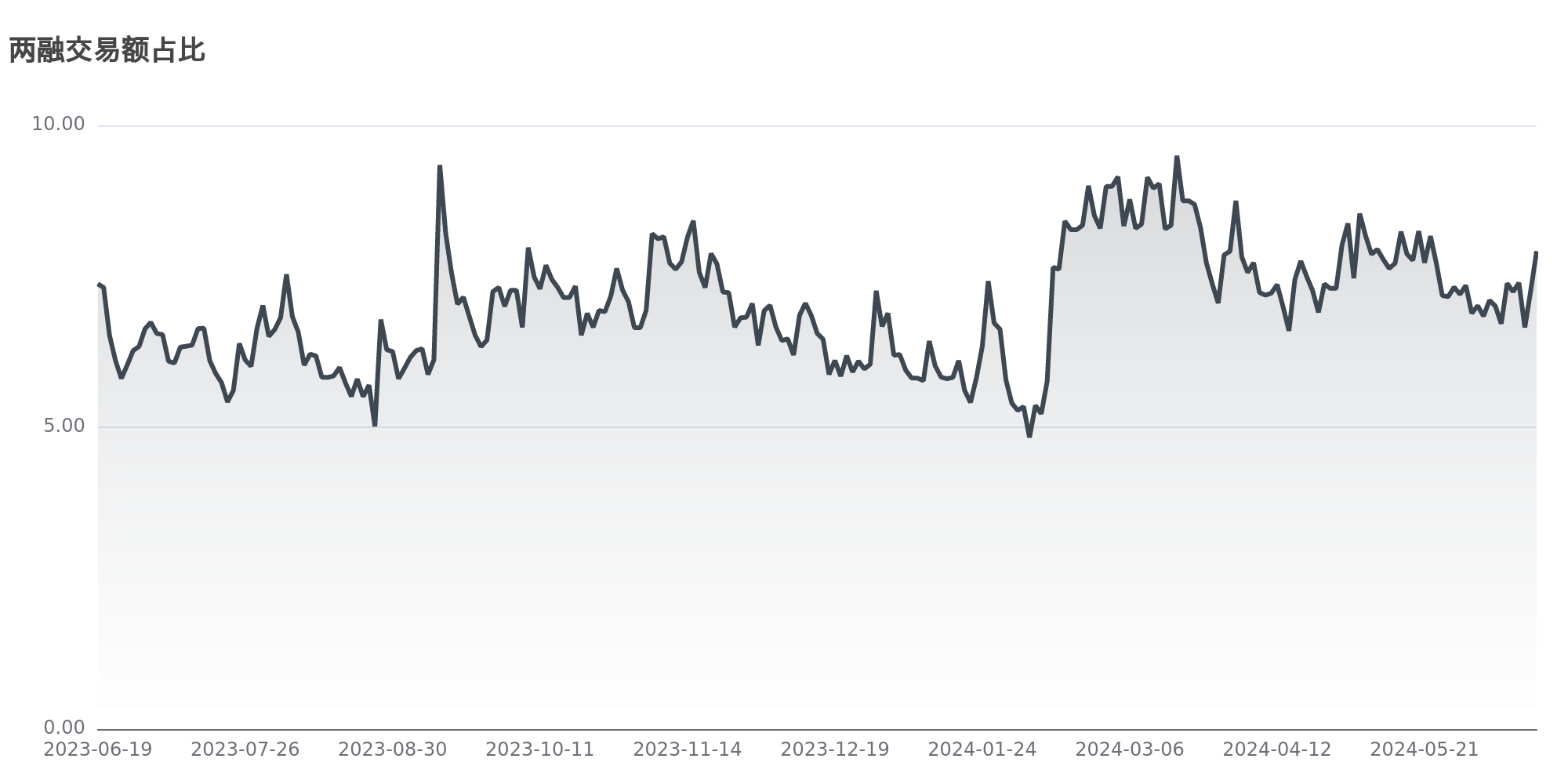 今日该指标值为7.92%,目前该指标处于近一年较高区间,认为当前A股市场相对较强。反映场内投资者借钱炒股的杠杆水平,该指标越高说明杠杆水平越高,即投资者认为当前市场较强,反之则说明投资者认为市场相对较弱,因而与上证指数存在较强的正相关性。