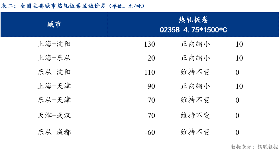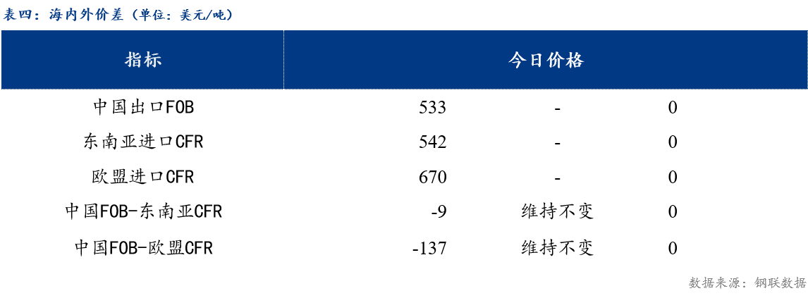 从区域价差来看,华东与东北价差130元/吨,较上一交易日正向缩小10元/吨;华东与华南价差20元/吨,较上一交易日正向缩小10元/吨;华南与华北价差为70元/吨,较上一交易日持平。