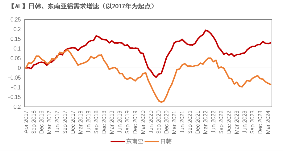 从铝消费来看,东南亚地区的铝消费增长在产能扩张的带动下显著的高于日韩的等发达国家。