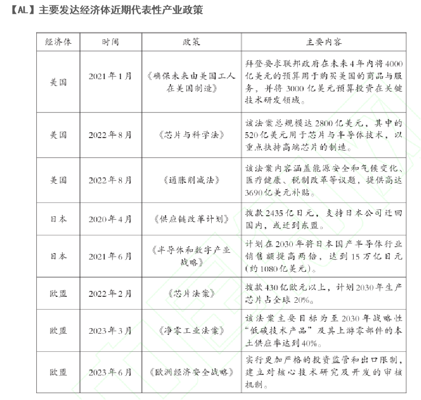1.以直接的财政支出为主导,从政策内容的实施节奏来看,各发达国家政府的产业政策均伴随着大量财政支持,如欧盟以及美国的芯片法案背后分别有着430亿欧元以及2800亿美元的财政支持;