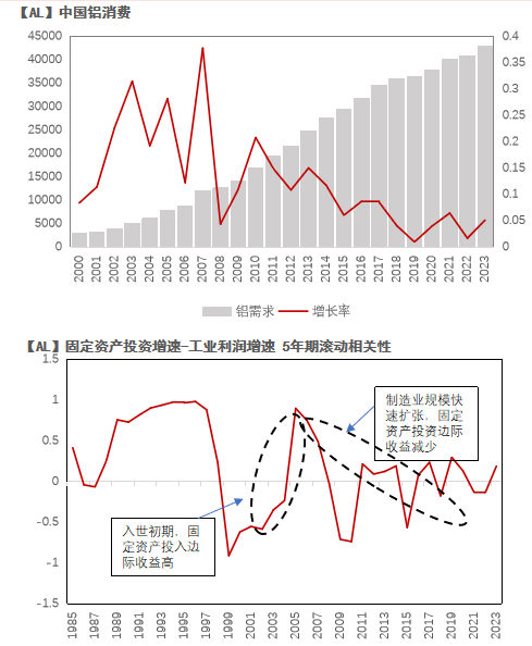 1.从铝需求的角度,在工业化和制造业投资的初期铝需求的增长是较为快速的,而到了后期,铝需求的增长中枢则会呈现出趋势性的下降;