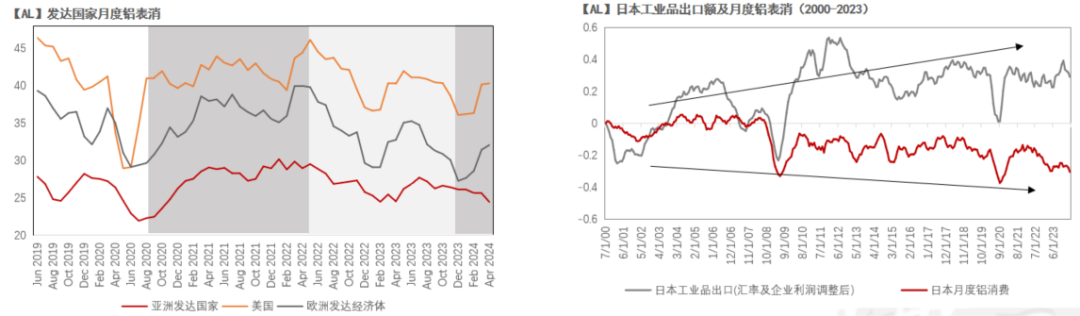 在短期内,金融流动性的放松(降息、扩大财政支出)对铝需求有着明显的刺激作用。2020年疫情后,随着以美联储为首的各国央行逐步释放流动性,各主要发达经济体的铝需求出现明显的周期性回升,而2022年开始的流动性边际收敛又得发达国家的铝消费开始整体下行。