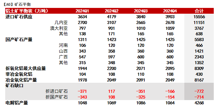 从目前的矿石平衡角度来看,全年矿石整体处于偏紧平衡的态势(过剩1.7%),从季度性来看,2024年3季度受到几内亚雨季影响,或存在一定的矿石缺口,因此我们认为氧化铝价格或将长期保持高位运行。