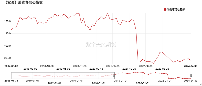 2024年,我国居民部门可支配收入仍处于缓慢增长态势,边际小幅态势4%-5%,并无预期外的额外增长,同时受限于对于未来收入的悲观预期,我国居民部门消费者信心指数仍处于较低水平。