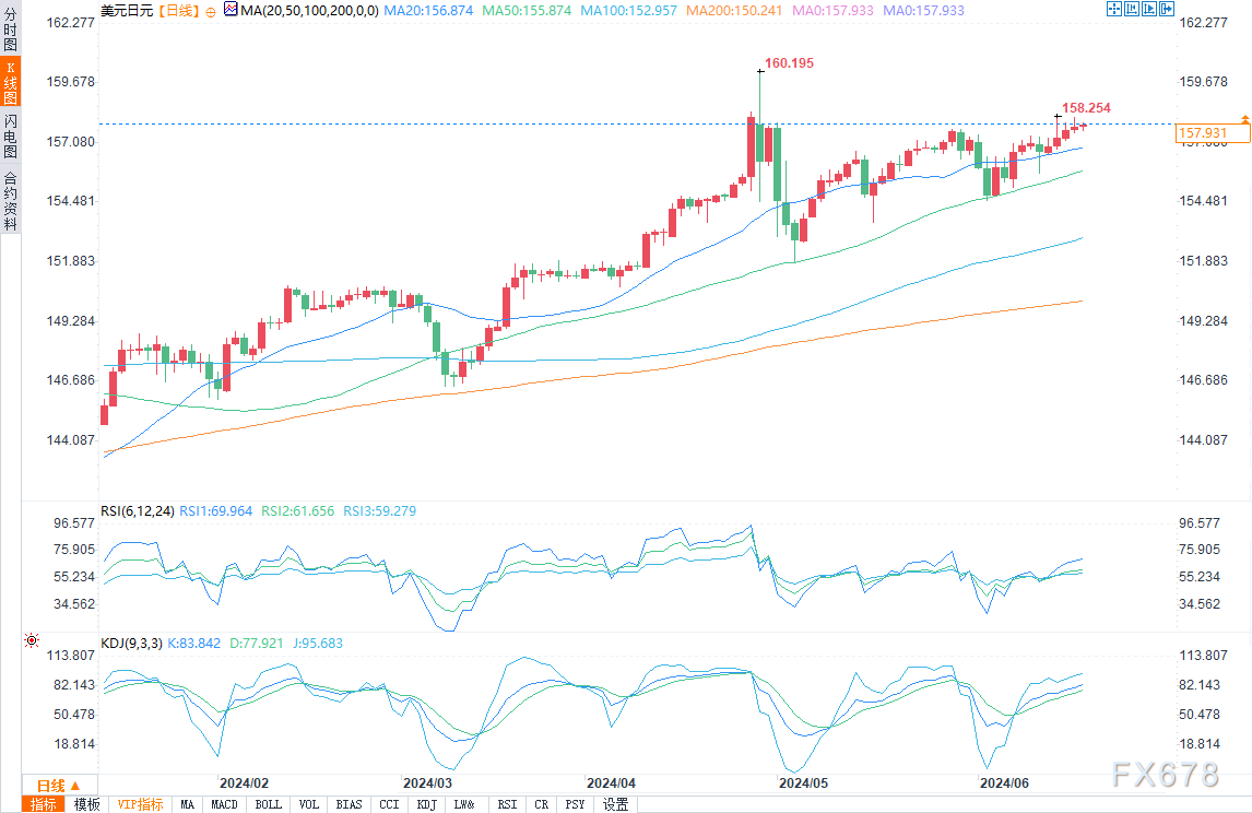 汇通财经APP讯——周三(6月19日)纽市盘中,美元/日元在欧市盘中下探至157.599的低点后v形反转,盘中报157.930,涨幅0.06%。