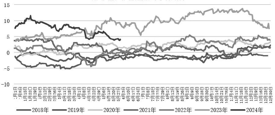 2024年1—2月,全球糖市供需预估相对平衡,糖价开始反弹修复。巴西产量超预期因素被市场逐步消化,而印度政府出台乙醇分流新政,限制糖向乙醇分流量,印度糖出口受限,支撑糖价。同时,国内春节假期前销售较好,现货表现强势,郑糖收于6566元/吨。2月下旬,受原糖期货2403合约淡季巨量交割131万吨的压制,郑糖快速下跌,之后在6230~6290元/吨区间震荡。进入3月,美联储降息预期以及原油上涨支撑宏观面,郑糖上行至6500元/吨一线后震荡运行。4月初,管控糖浆、糖粉的政策出台,郑糖主力2405合约最高触及6795元/吨。4月中上旬,巴西提前开榨,原糖、白糖价差小幅回落,供应压力使郑糖再度下行,5月中旬最低触及6090元/吨。5月底在巴西5月上半月制糖比不及预期的驱动下,郑糖小幅反弹至6300元/吨之上。