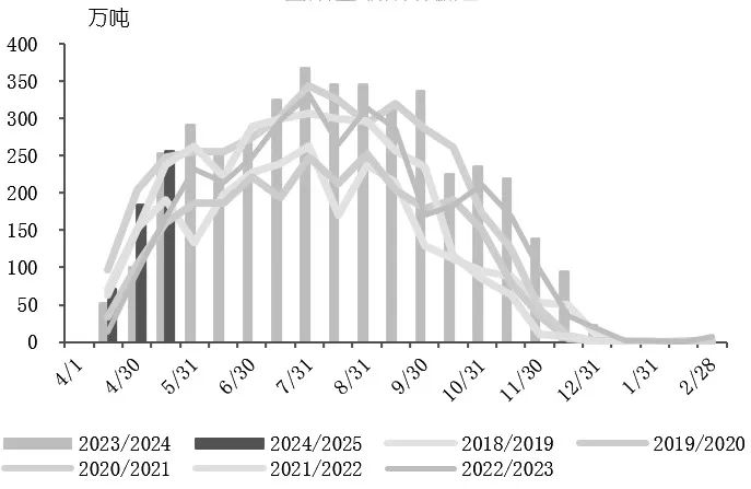 从5月下半月的数据来看,在初期天气干燥适合压榨以及开机时间较上榨季提前的情况下,双周产糖量较上个榨季同期降低20万吨。市场对巴西中南部2024/2025榨季甘蔗产量的核心预估区间在4100万~4300万吨,制糖比接近技术极限的51%~52%,高产量被单产和高制糖比支撑。如果榨季后期干旱无法改善,甘蔗质量下降,并且乙醇销售火热使糖厂没有更高的制糖意愿,巴西存在产量不及预期的可能性,因此需要对降水量以及影响制糖比的糖醇溢价多加关注。