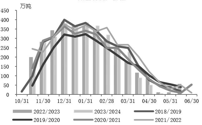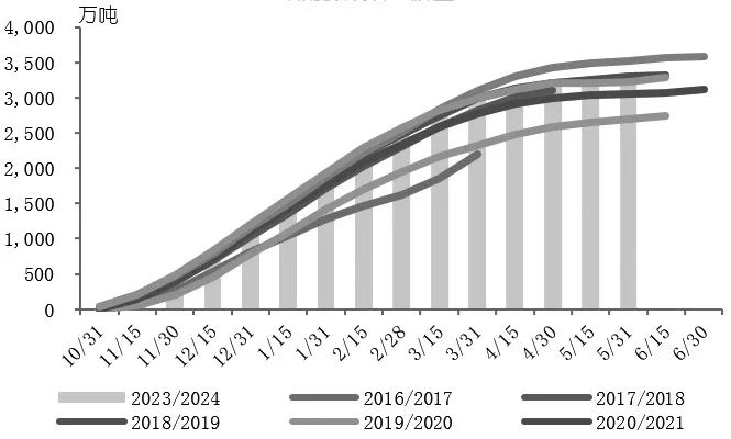 据印度糖厂联合会(NFCSF)发布的数据,2023/2024榨季截至5月31日,印度已有531家糖厂收榨,还有3家糖厂未收榨;甘蔗入榨量为31378.5万吨;累计产糖3167万吨。印度2023/2024榨季基本宣告结束,产糖量低于此前糖业协会(ISMA)3200万吨的预期。同时,印度政府在2023年10月至2024年5月向糖厂下发1960万吨糖销售配额,同比增加9%,因此此前基于2023/2024榨季印度糖净产量为3200万吨、消费量为2900万吨、期末食糖库存为900万吨的市场预期进一步调低,2024/2025榨季开局印度库存更为紧张。