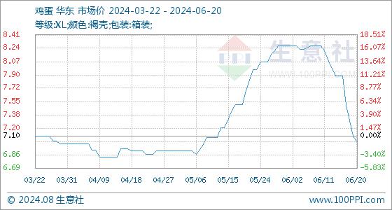 6月20日,生意社鸡蛋基准价为7.10元/公斤,与本月初(8.27元/公斤)相比,下降了-14.15%。