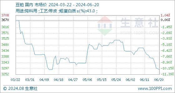 6月20日,生意社豆粕基准价为3296.00元/吨,与本月初(3430.00元/吨)相比,下降了-3.91%。