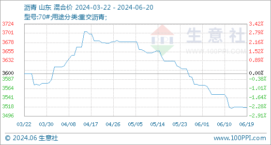 6月20日,生意社沥青基准价为3516.57元/吨,与本月初(3572.29元/吨)相比,下降了-1.56%。