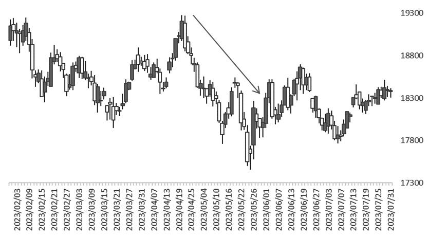 自4月下旬开始,铝价出现持续震荡回落,5月11日现货价格低于5月均价近100元/吨,A公司决定点价买入100吨现货,锁定差价利润,但价格下行过程中其下游客户亦采取观望策略,于是A公司决定买入2306P17800看跌期权合约100吨,防止后期敞口大幅下行的风险。同时为减少成本支出,在2306C18400和2306C18500期权合约上分别卖出100吨,以降低期权买入成本以及获取备兑收益。