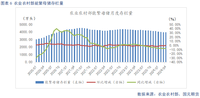 根据农业农村部数据显示,2024年4月末全国能繁母猪存栏量3986万头,同比下降6.9%,环比下降0.1%,生猪产能去化效果逐步显现。随着我国生猪生产效率提升和猪肉消费需求等变化,3月1日农业农村部新修正的《生猪产能调控实施方案》发布,提出将能繁母猪正常保有量从4100万头下调至3900万头,以此来看,当前存栏基数的实际产能依旧偏大,限制猪价上行幅度。2023年1月-2024年4月能繁母猪存栏连续16个月环比下调,从生猪生产周期推算,2024年理论供给量呈逐步下行趋势,伴随着产能去化,中长期供需改善预期向好,价格重心将逐步抬升。