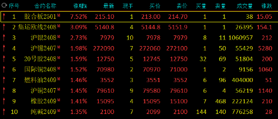 早盘收盘,国内期货主力合约涨多跌少。集运指数涨超3%,沪银涨超2%,沪锡、国际铜、20号胶、沪铜、燃料油、橡胶、纯碱涨超1%;跌幅方面,沪铅、焦煤跌超1%。
