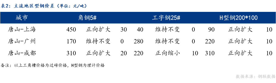 从区域价差来看,今日唐山与上海、成都角钢价差正向扩大,与广州角钢价差维持不变;唐山与上海、广州工字钢价差维持不变,与成都工字钢价差正常缩小;唐山与上海、广州、成都H型钢价差正向扩大。