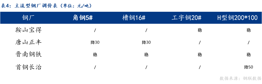 2、成交量为20家型钢厂当日成交,其中包括工字钢6家、角钢7家、槽钢7家。
