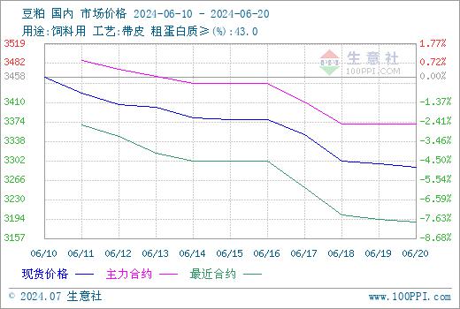 据生意社商品行情分析系统显示:端午节过后,利空打压,国内豆粕行情跌跌不休。6月10日,豆粕市场均价3458元/吨,6月20日,豆粕市场均价3290元/吨,下跌4.86%。