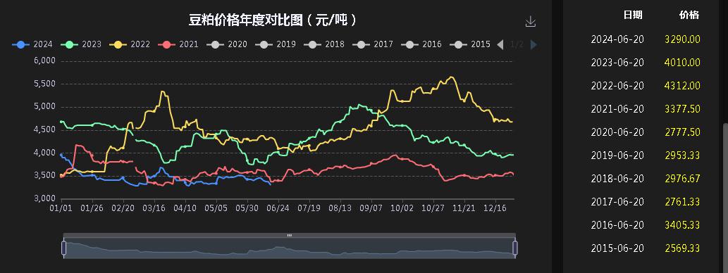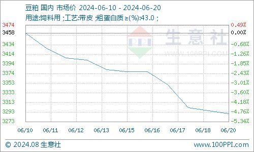 根据生意社豆粕价格年度对比图可以看出,2024年1-2月,豆粕行情持续下跌,跌幅超16%。3月迎来上涨行情,振荡上涨半个月之后继续下跌将近一个月,4月15日开始,豆粕再度迎来短暂反弹,上涨过后,继续弱势振荡,价格持续3300元/吨左右。5月豆粕行情整体振荡上涨,涨幅2.69%。6月以来,豆粕行情再度短暂上涨,然后高台跳水,行情跌跌不休,6月20日,豆粕跌至3290元/吨,处于2024年年内最低点。