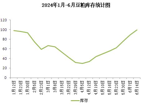 库存:根据生意社豆粕库存统计图可以看出,2024年1-4月豆粕库存量不断下滑,4月5日当周豆粕库存处于年内最低点,仅有30万吨。4月中旬开始,豆粕库存量呈现反弹之势,不断增加。4月19日当周,豆粕库存已经超44万吨。5月开始,豆粕不断累库,库存量不断走高,进入6月,豆粕库存更是居高不下,截止14日当周,豆粕库存增加至100万吨左右,创年内新高。库存压力不断增加,豆粕行情走弱。