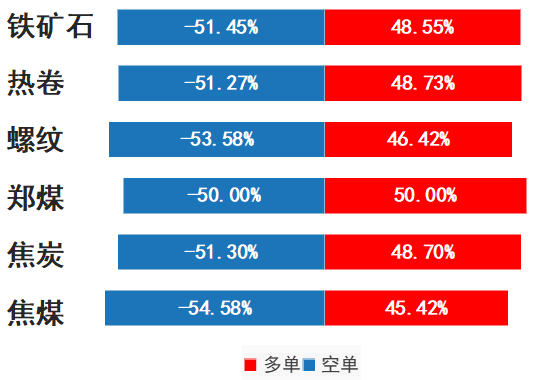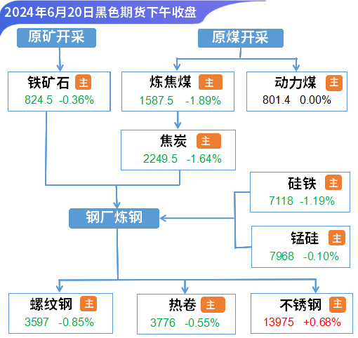 今日黑色期货下跌为主,截至收盘,炼焦煤期货收1587.5,下跌1.89%;焦炭期货收2249.5,下跌1.64%;热轧期货收3776,下跌0.55%;螺纹期货收3597,下跌0.85%;热卷期货低开走低,盘中震荡,成交增加,收小阴线;螺纹期货低开低走,震荡运行,成交增量,收小阴线。热卷主力合约前20成交64.05万手,增加16.49万手;螺纹钢主力合约前20成交262.99万手,增加99.20万手;