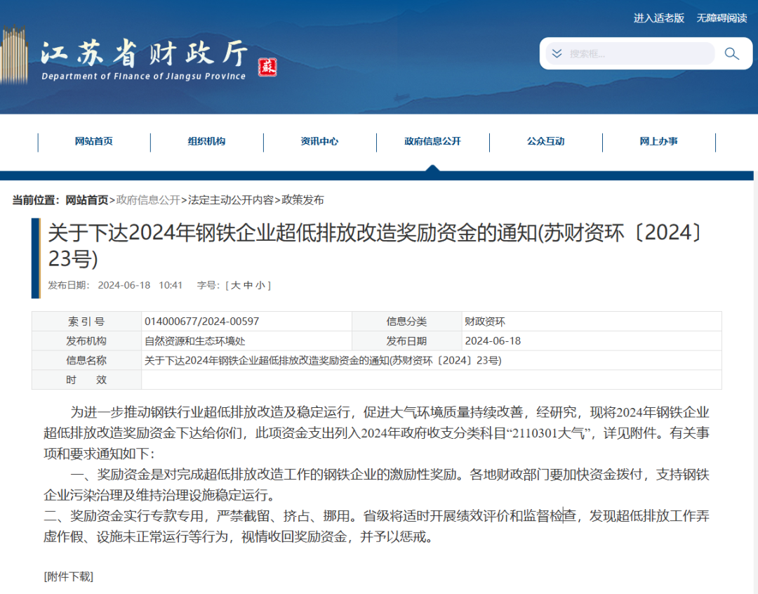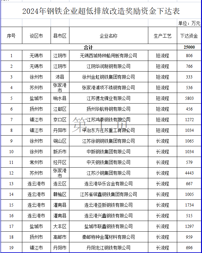 6月18日江苏省财政厅发布了关于下达2024年钢铁企业超低排放改造奖励资金的通知(苏财资环〔2024〕23号)。沙钢、德龙镍业、徐钢、中新、亚新、中天、联鑫、镔鑫、鸿泰、兴鑫、秦邮特钢、金虹、华润制钢、华航特钢、华乐冶金等19家钢企获得超低排放改造奖励资金2.5亿元。其中德龙镍业最高,获得5803万元;沙钢第二,4443万元。