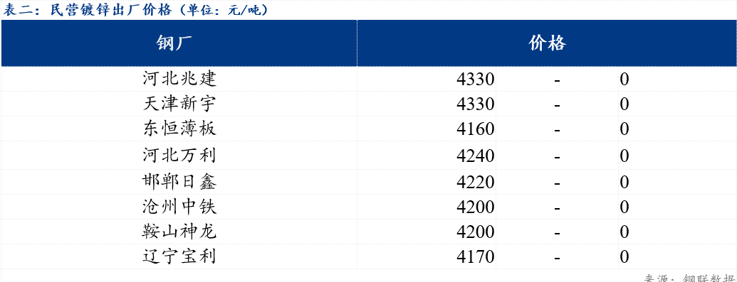 现北方地区民营镀锌板卷整体出厂价格在4160-4330元/吨。