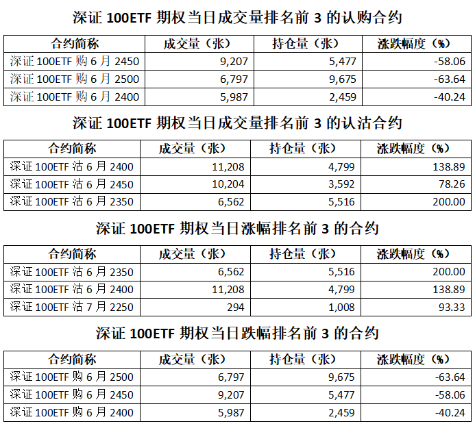 深证100ETF期权总成交面额21.12亿元,增加61.19%,期现成交比为0.03,权利金成交额0.22亿元;期权总成交量86,672张,增加63.34%,其中认购期权成交量42,772张,认沽期权成交量43,900张,认沽认购成交比率为1.03(上一交易日认沽认购成交比率为1.16)。