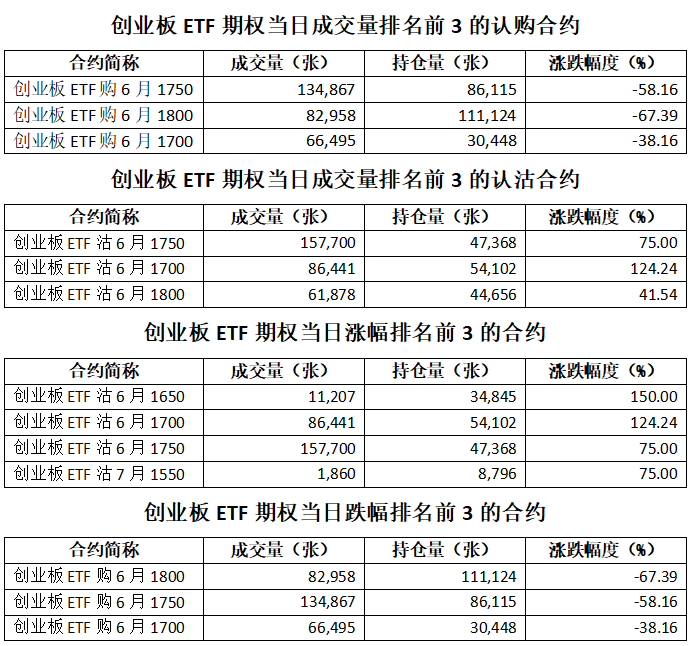 创业板ETF期权总成交面额154.68亿元,增加2.53%,期现成交比为0.33,权利金成交额2.54亿元;期权总成交量880,020张,增加3.59%,其中认购期权成交量431,744张,认沽期权成交量448,276张,认沽认购成交比率为1.04(上一交易日认沽认购成交比率为0.96)。