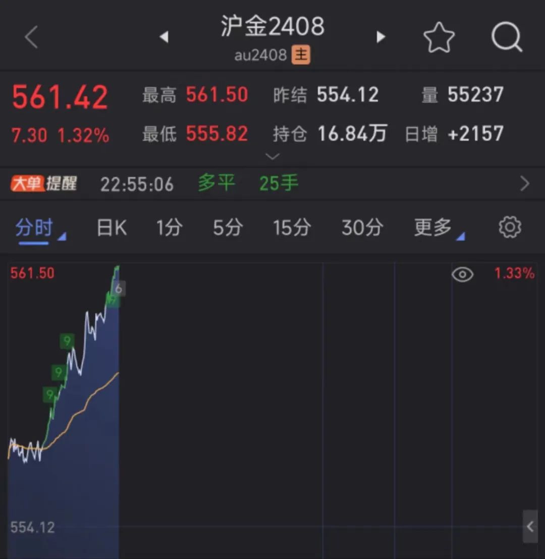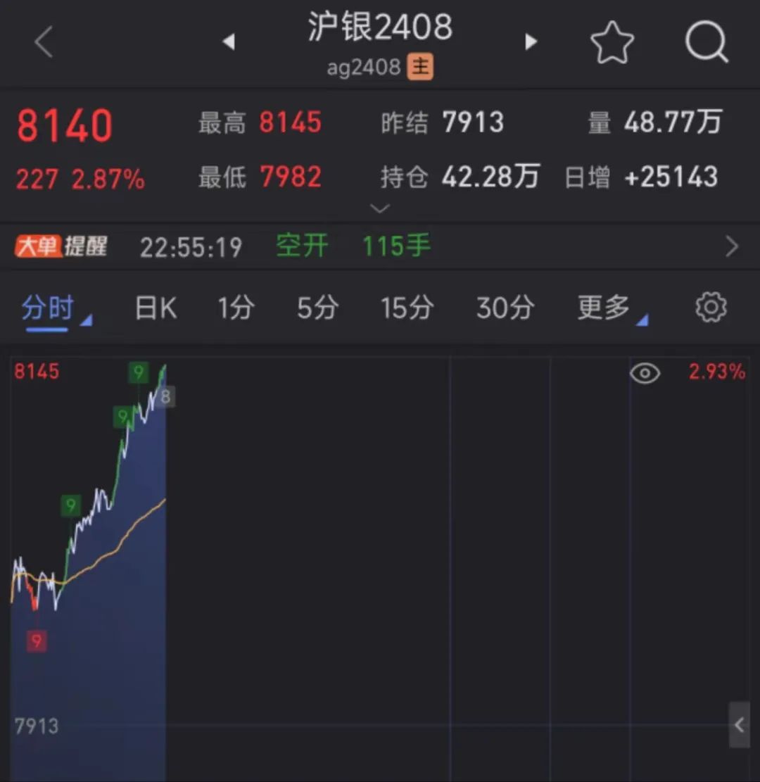 受外盘影响,国内黄金白银期货也飙涨。截至发稿,沪金主力合约、沪银主力合约分别报涨1.32%、2.87%。
