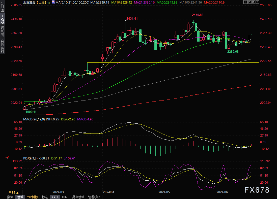技术面来看,日线级别,金价目前顶破了50日均线2343.82关键位置,MACD结成金叉,KDJ金叉运行,在失守50日均线前,短线走势偏向多头,上方阻力关注6月7日高点2387.59和2400关口附近阻力。