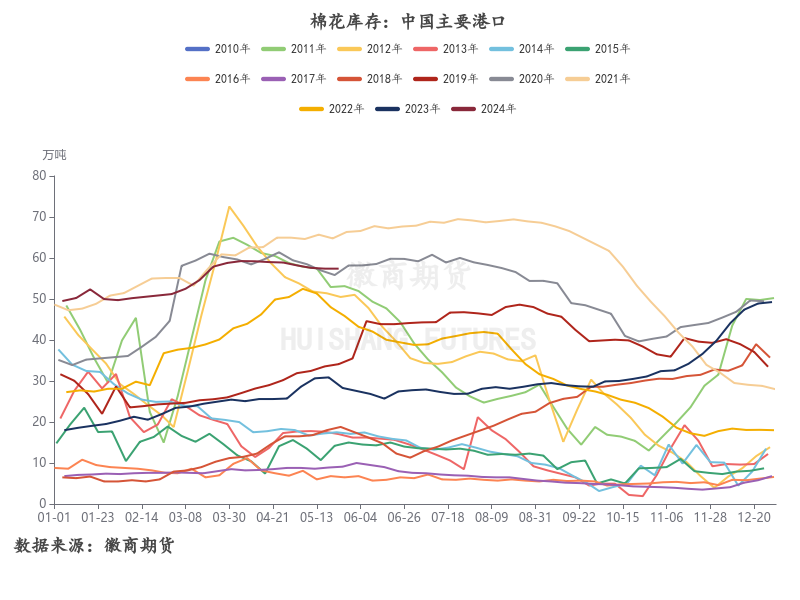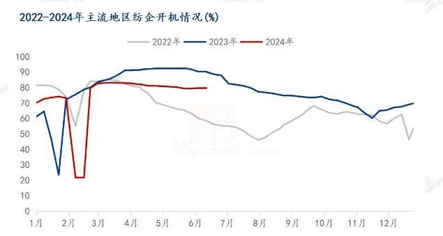 同时,预期港口库存短期下行较难,主要是同期主流地区开机负荷率在6月份和7月份有季节性下行的趋势。根据Mysteel农产品数据监测,截至5月24日,主流地区纺企开机负荷为79.7%,环比增幅0.38%,规模大厂开工相对稳定,订单有一个月水平,整体市场询单问价增加,纺企开机负荷小幅增加。