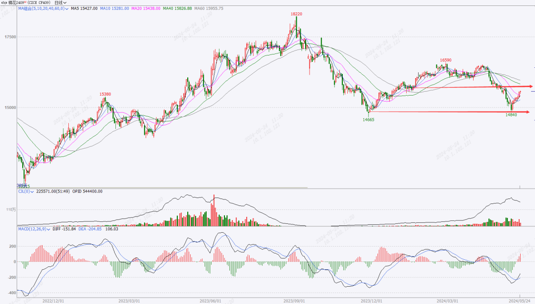 在5月份,郑棉走势呈现V型走势。先是在国际五一节过后,郑棉跌破前期震荡平台,连续5个交易日走跌,期价创2024年上半年阶段性新低14840元/吨的价位,主要受五一期间美棉价格大幅下跌拖累。同期国际棉花已经跌至2022年的低位,随后在底部震荡后短期反弹至4月底底部震荡位置。郑棉超跌反弹后,目前已至前期震荡平台15600元/吨处,短期看仍有下行压力。