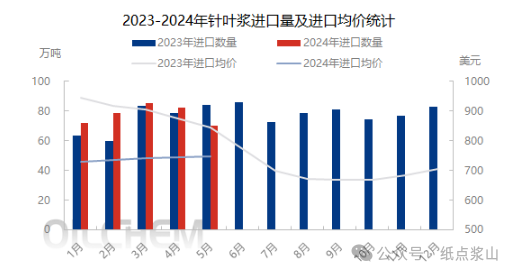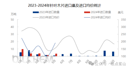 海关数据显示,2024年5月漂白针叶浆进口数量70.4万吨,环比-14.2%,同比-16.4%。全年累计进口量387.9万吨,累计同比+5.0%。