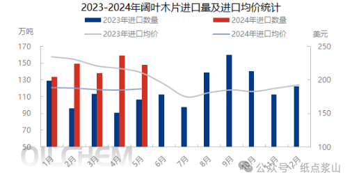 海关数据显示,2024年5月针叶木片进口数量3.6万吨,环比+98.2%,同比+173.6%。全年累计进口量23.1万吨,同比+18.5%。
