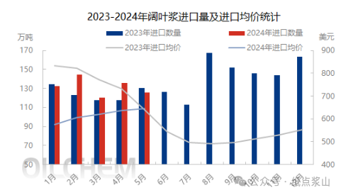 海关数据显示,2024年5月漂白阔叶浆进口数量125.6万吨,环比-7.5%,同比-3.6%。全年累计进口量658.0万吨,累计同比+5.7%。