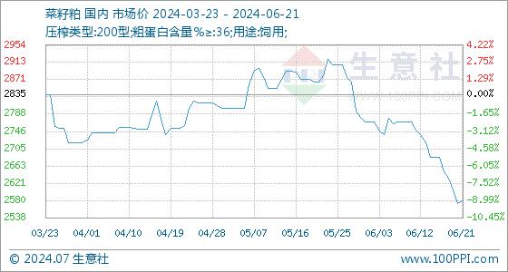 6月21日,生意社菜籽粕基准价为2573.33元/吨,与本月初(2770.00元/吨)相比,下降了-7.10%。