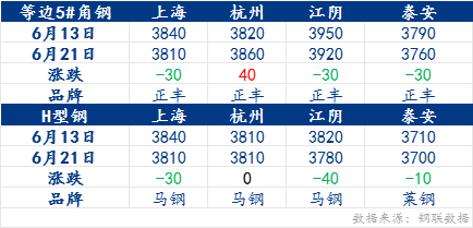 据Mysteel调研数据来看,截止6月21日,上海5#角钢价格3810元/吨,周环比下跌30元/吨,H型钢200*200价格3810元/吨,周环比下跌30元/吨;杭州5#角钢价格3860元/吨,周环比上涨40元/吨,H型钢200*200价格3810元/吨,周环比持稳;江阴5#角钢价格3920元/吨,周环比下跌30元/吨,H型钢200*200价格3780元/吨,周环比下跌40元/吨;泰安5#角钢价格3760元/吨,周环比下跌30元/吨,H型钢200*200价格3700元/吨,周环比下跌10元/吨。