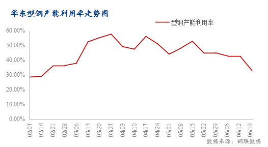 本周华东型钢产能利用率较上周环比下降9.5%,库存较上周环比下降27.4%。
