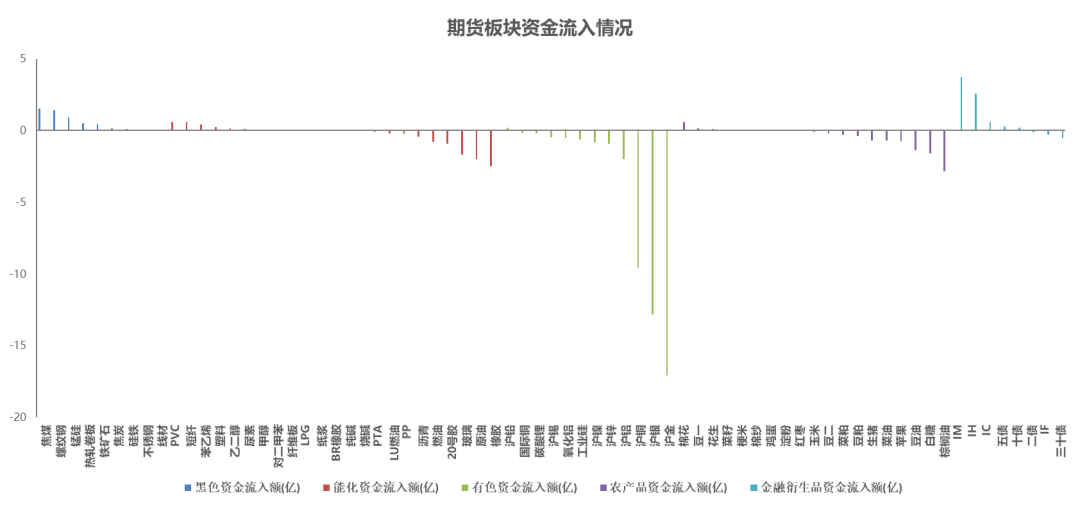 从板块资金流动情况来看,股指、黑色多数流入,有色、能化多数流出。