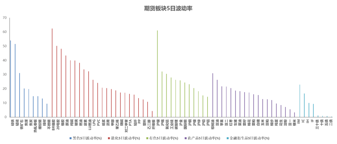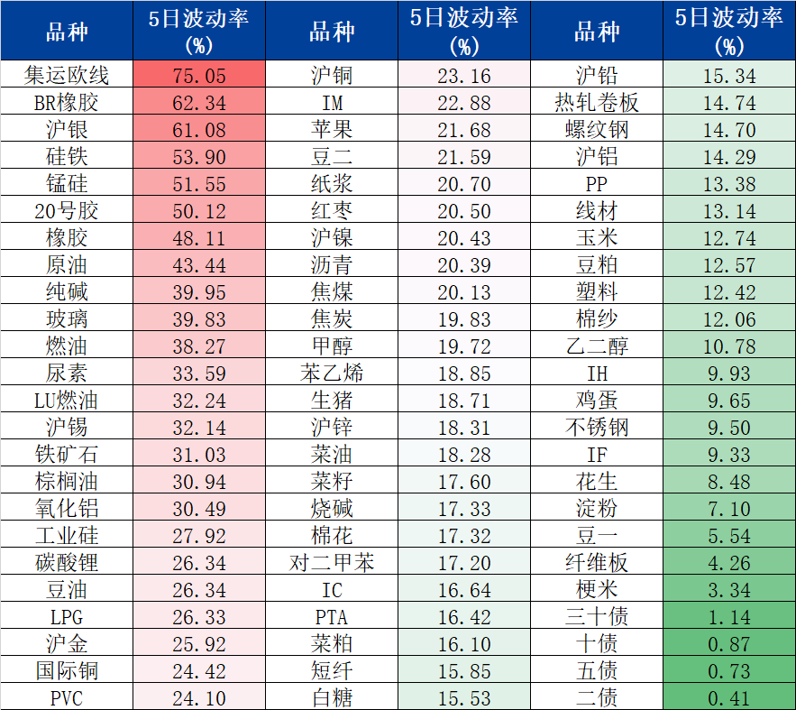 从5日波动率水平看,前三位为集运欧线、BR橡胶和沪银;低波动前三品种为二债、五债和十债。