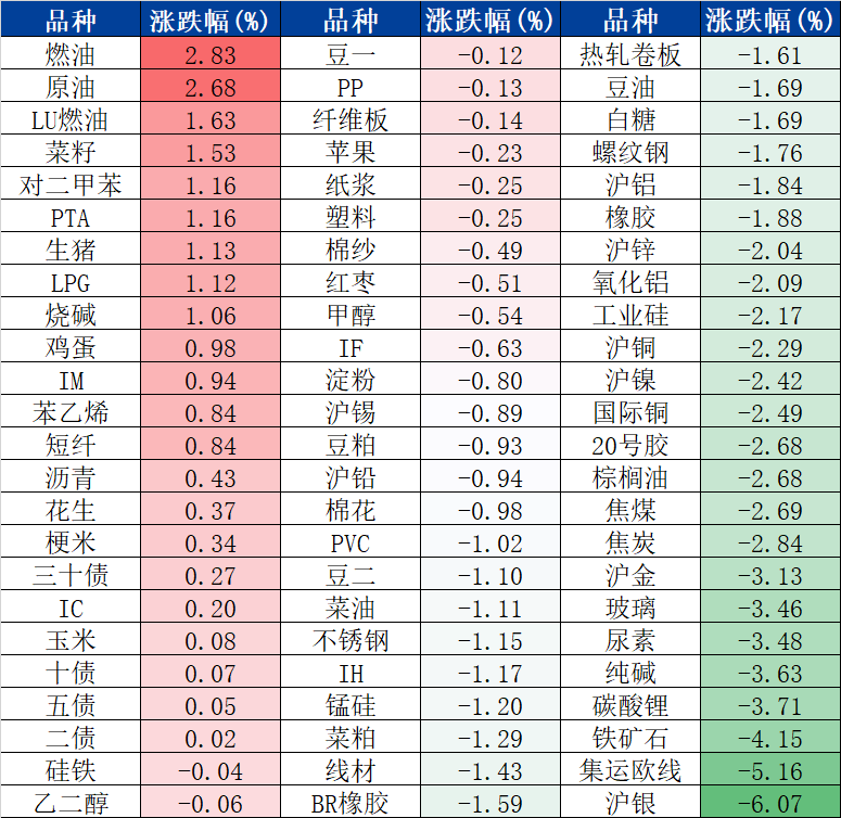 涨幅居前的三个品种分别是燃油、原油和LU燃油;跌幅居前的是沪银、集运欧线和铁矿石。