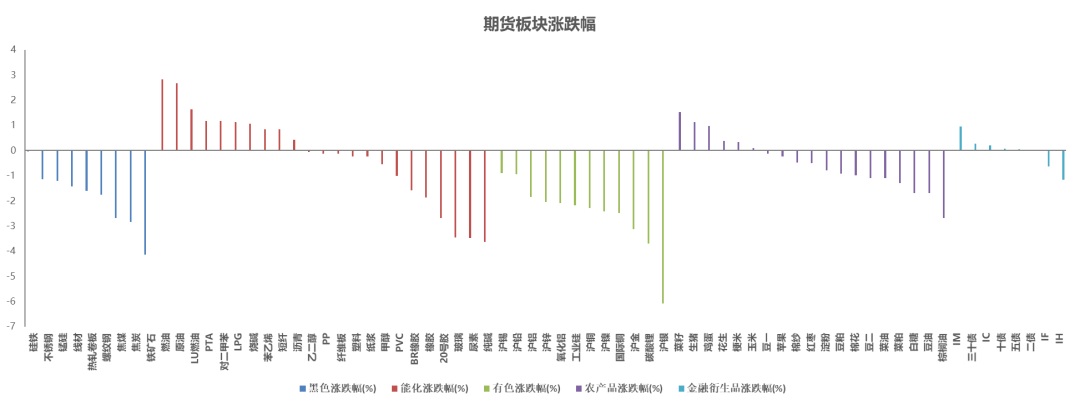 从板块整体表现看,能化、国债多数上涨,有色、黑色下跌。