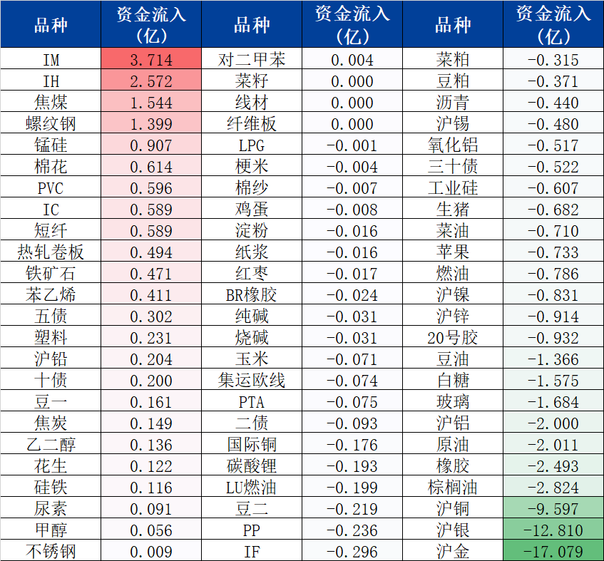 资金流入前三名为IM、IH和焦煤;流出前三名分别为沪金、沪银和沪铜。